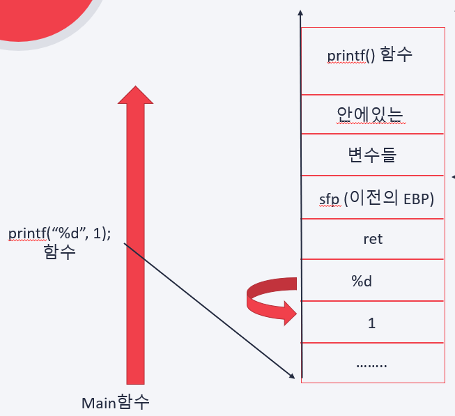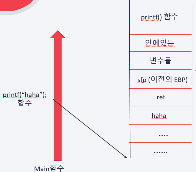 main함수에서 printf를 선언했을때, 먼저 인자인 "haha"가 먼저 쌓이게 되고
