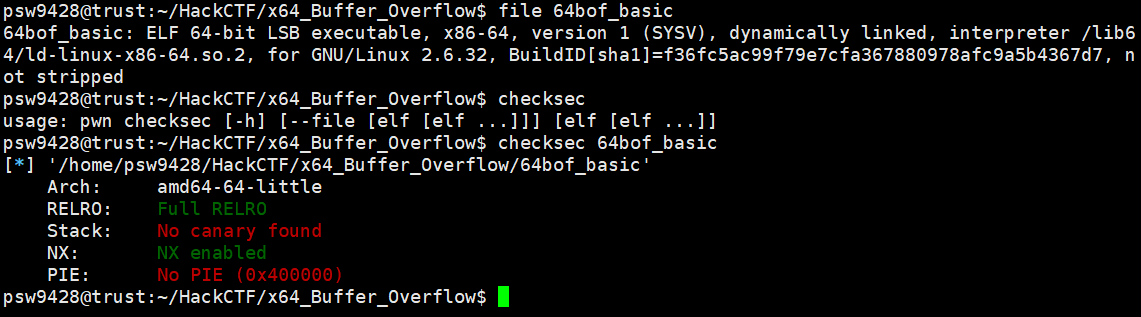 64bit 기반 ELF 파일이면서, NX bit가 활성화 되어 있습니다.