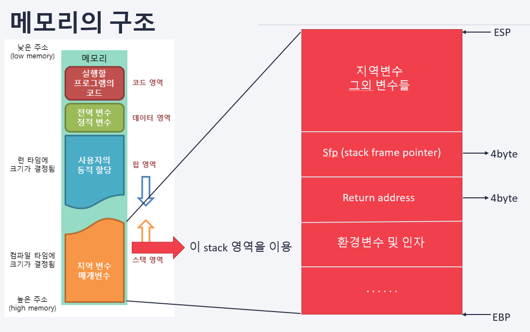 32비트 기준으로 설명하자면 우리는 함수를 호출할때 스택이라는 메모리공간에서 이렇게 쌓이게 됩니다.